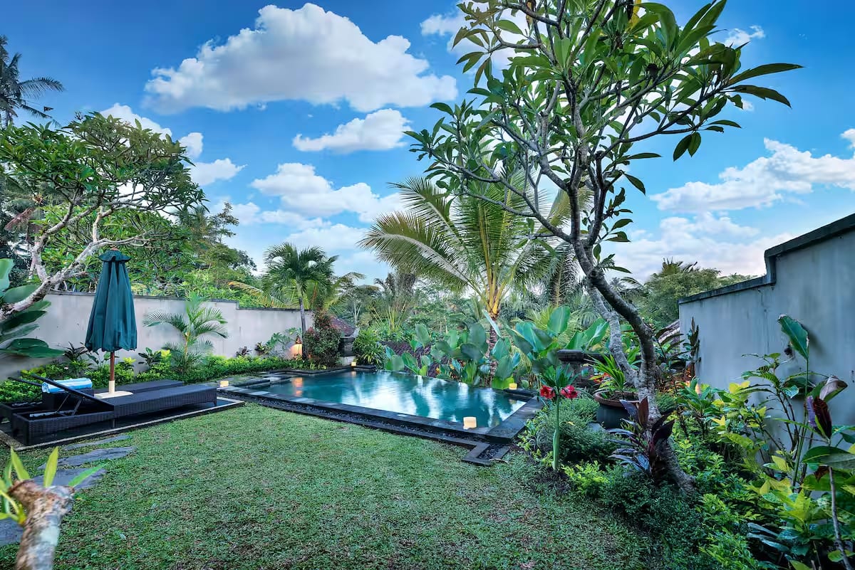 Your Modern Oasis in Ubud's Green Heart Escape to your private sanctuary nestled amidst the lush greenery of Ubud! Our villa offers a tranquil escape designed for ultimate comfort and rejuvenation. Unwind in Style Step into a world of modern design where every detail enhances your stay. Our air-conditioned villa boasts a sleek, contemporary aesthetic and features a private swimming pool – your personal haven for refreshing dips under the Bali sun. Relax indoors with a flat-screen TV and seamless Wi-Fi connection, keeping you entertained and connected. Indulge in Pure Bliss Elevate your relaxation with our curated in-villa spa menu. Imagine pampering yourself with a traditional Body Lulur, melting away tension with a Hot Stone Massage, or revitalizing your skin with an Essential Facial. We also offer luxurious hair treatments and invigorating Thai Yoga Massages, ensuring a bespoke wellness experience right in the comfort of your villa. Come discover the perfect blend of modern luxury and serene nature. Your unforgettable Ubud escape begins here!